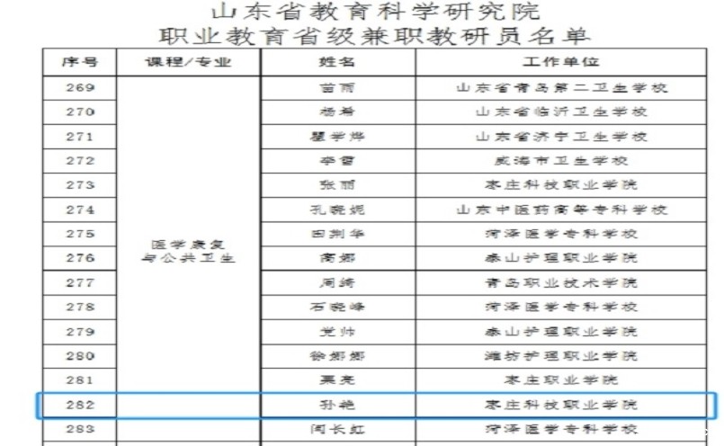 近日,山东省教育科学研究院公示了职业教育省级兼职教研员名单,医药卫生学院的孙艳老师成功入选。作为兼职教研员,其职责将围绕全省职业教育教科研工作重点,协同省教科院为省教育厅等各级教育行政部门科学决策...